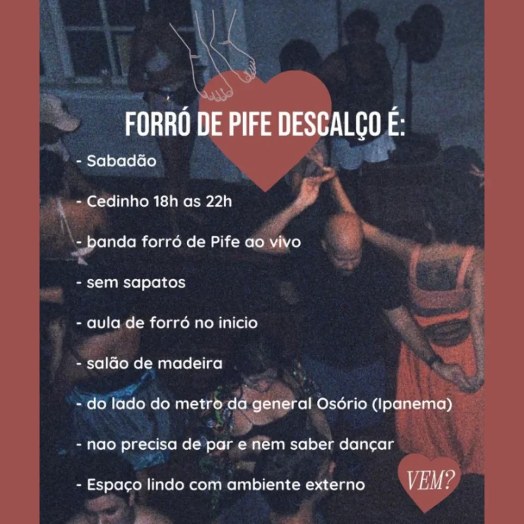 TODO sábado é dia de Forró sem sapatos na Rampa (Sá Ferreira 202, metrô da general Osório saída Sá Ferreira) no nosso salão de madeira. O evento começa 18h com aula de forró e logo começa o baile do @forrodepife no salão de madeira mais lindo do RJ até 22h